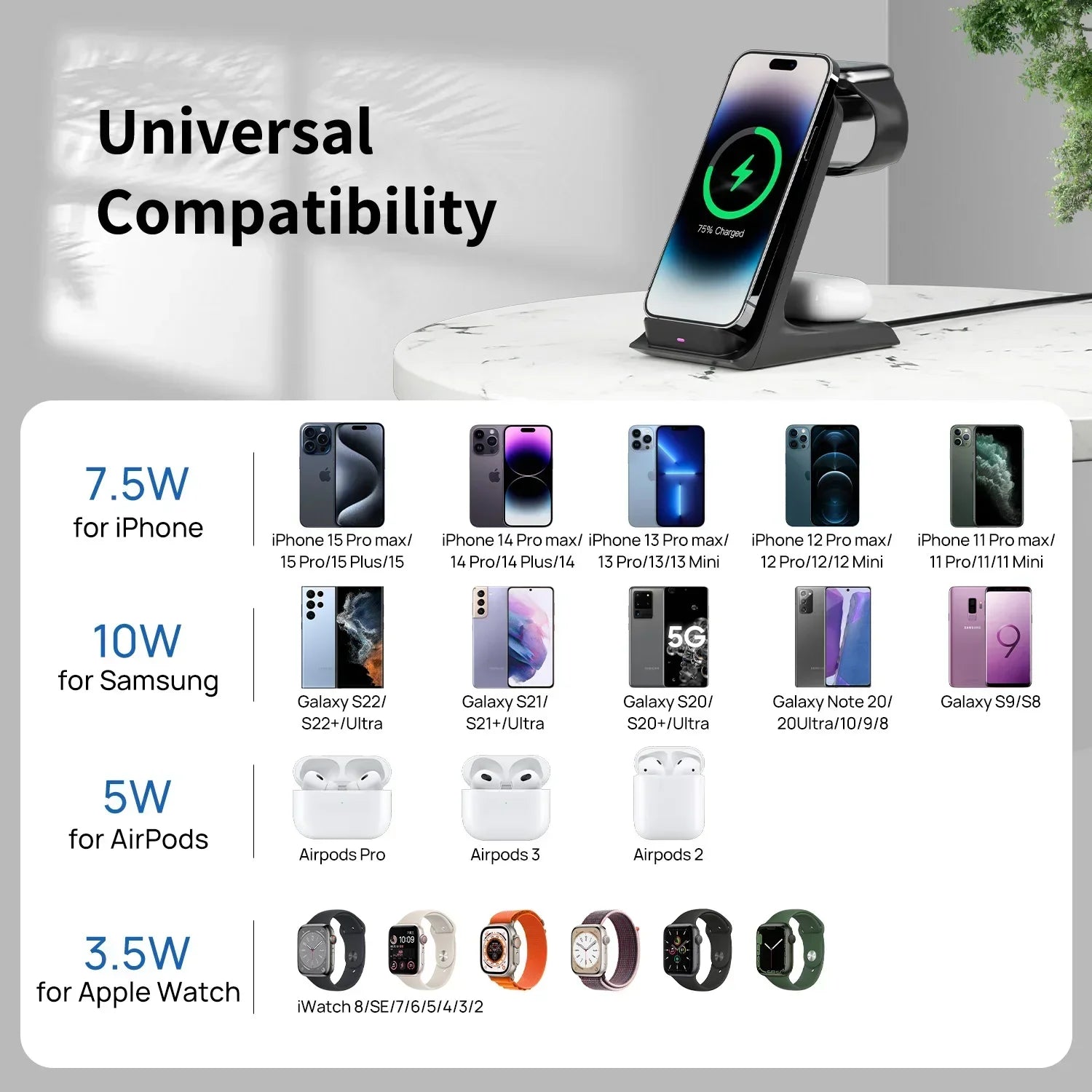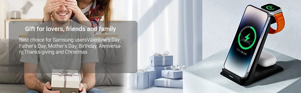 Experience the convenience of the KPON 3-in-1 Charger. This fast charging station is compatible with iPhone 13-16 Pro Max, Apple iWatch 5-9, and AirPods 2-3. It offers efficient and simultaneous charging for multiple devices, making it perfect for home or office use.
