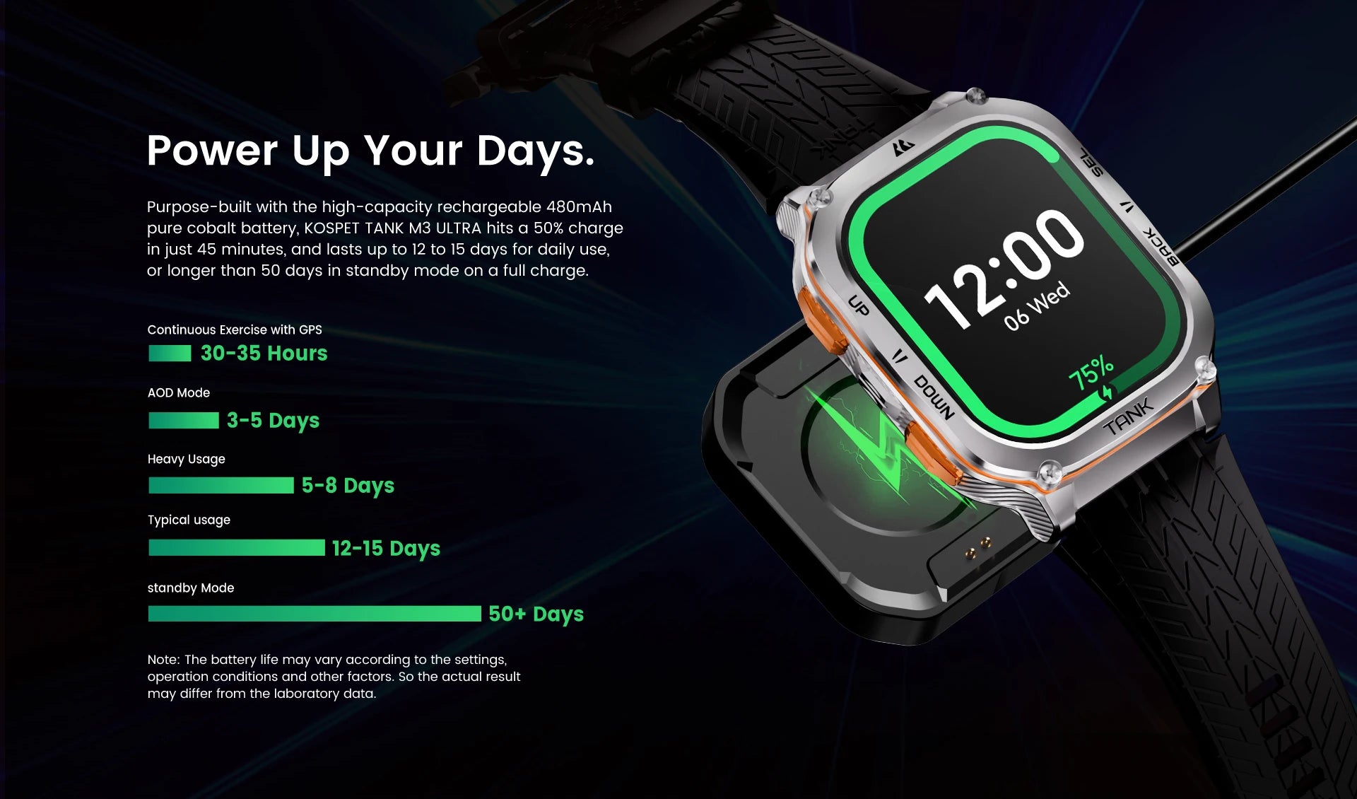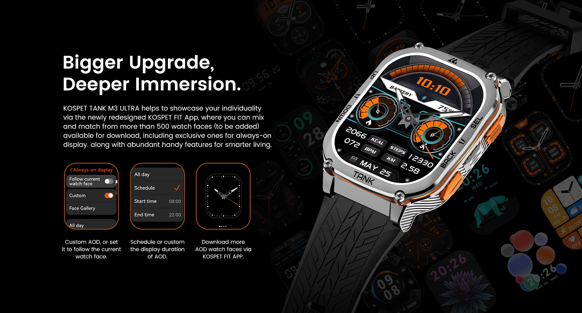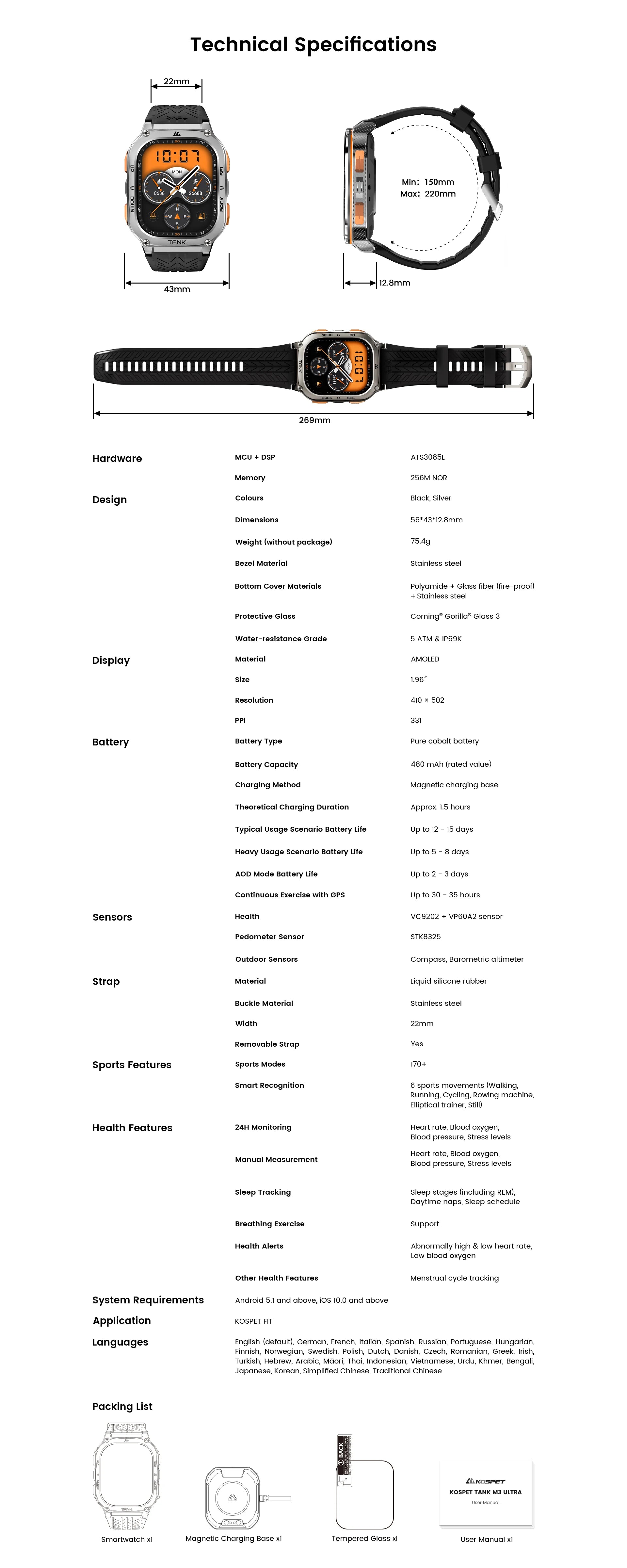 Discover the KOSPET TANK M3 Ultra GPS Smart Watch. This rugged smartwatch features a 480mAh battery, waterproof design, and AMOLED always-on display. Perfect for fitness enthusiasts, it offers dual GPS, Bluetooth connectivity, and digital fitness tracking. Stay connected and track your health with this durable and stylish smartwatch.